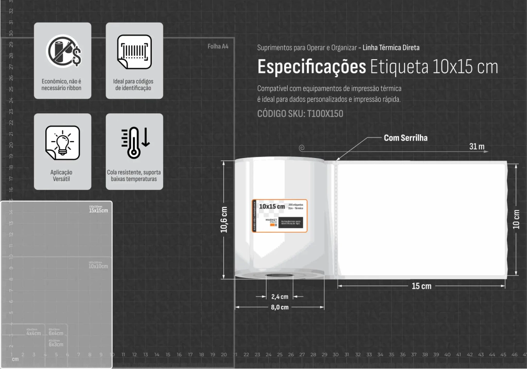 Etiqueta Adesiva Térmica 10x15cm (205unid./rolo) para impressoras ZEBRA, ARGOX, ELGIN, etc. Ideal para ecommerce e envios. Sem uso de ribbon